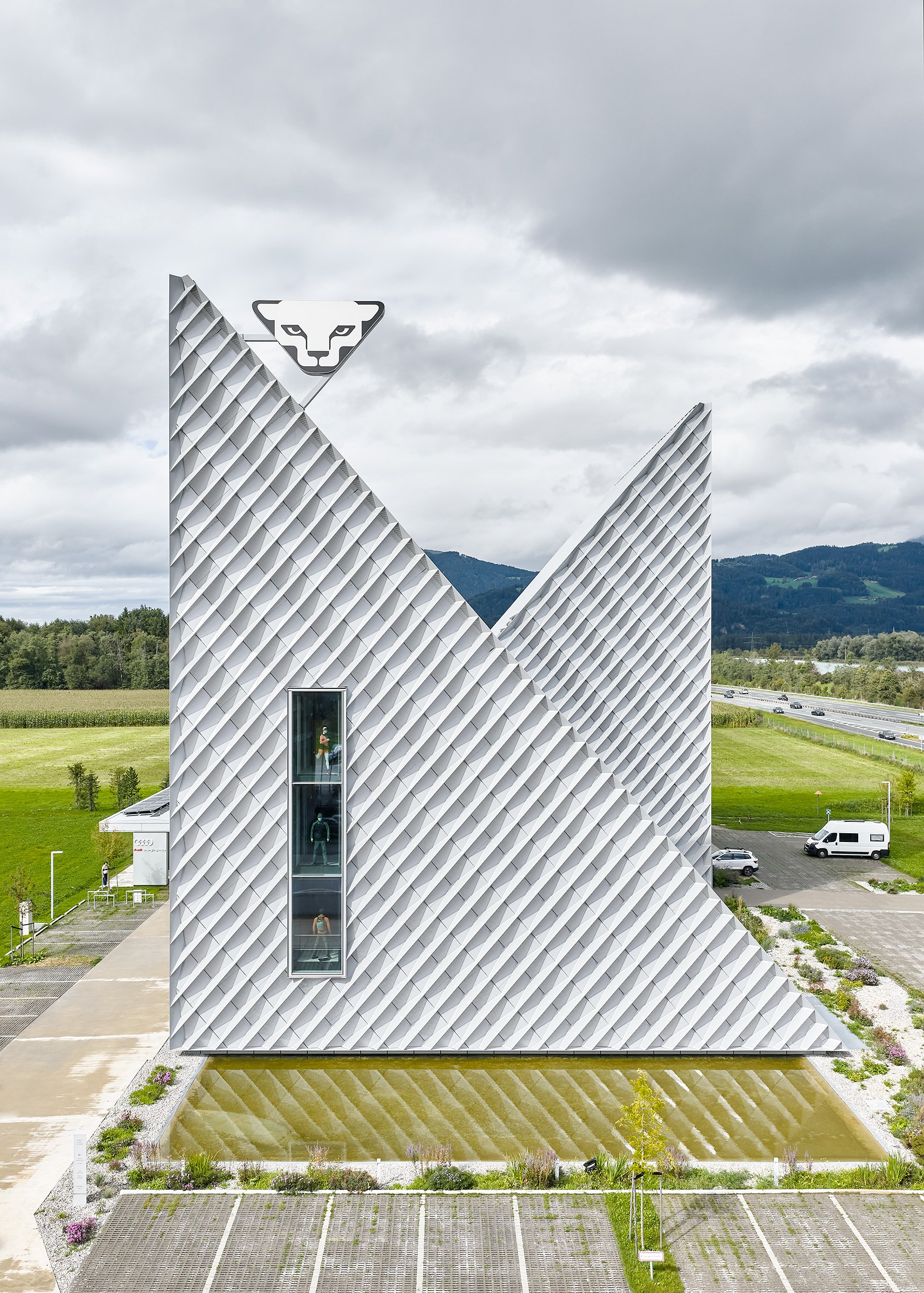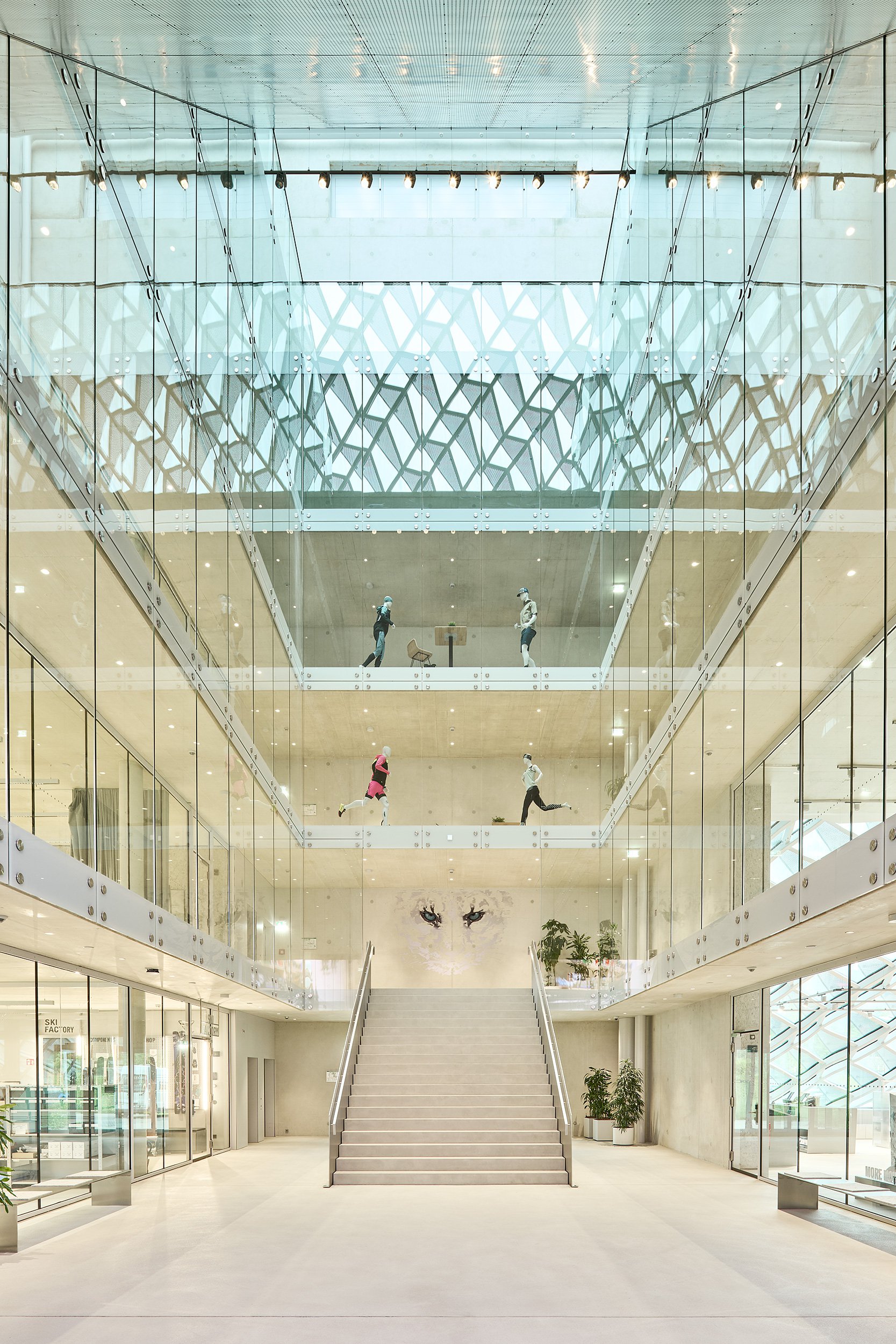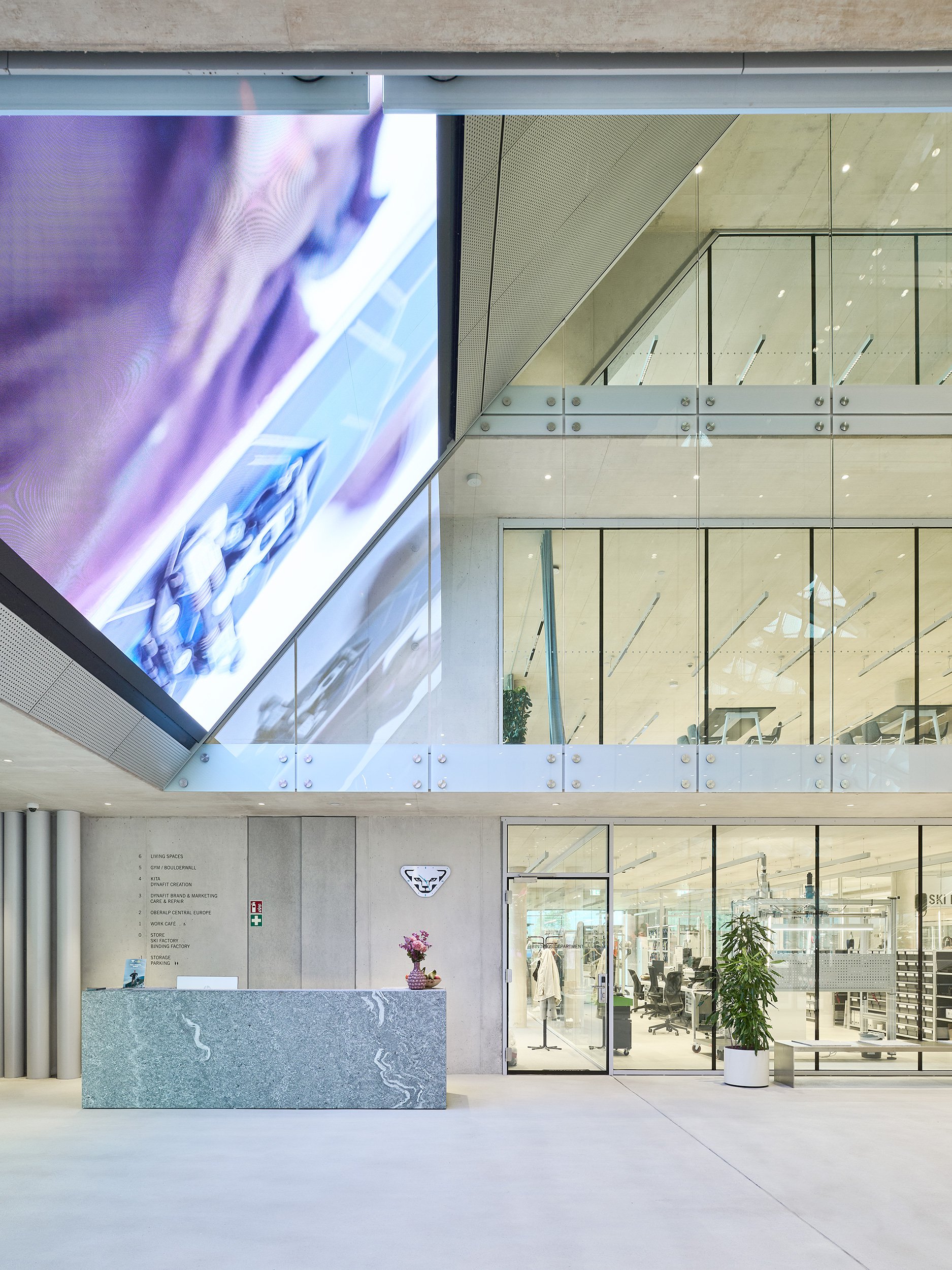 Con la costruzione della nuova sede centrale del marchio Dynafit ai piedi delle Alpi è sorta una sede aziendale moderna, funzionale e allo stesso tempo architettonicamente sofisticata, che riflette nella sua struttura i valori degli sport di montagna. Il nuovo edificio riunisce uffici e spazi commerciali con aree di sviluppo e test, oltre a un ampio bistrot, in una struttura chiaramente articolata che si integra armoniosamente nell'ambiente alpino. La progettazione strutturale ha dovuto affrontare la sfida di combinare un concetto di spazio aperto e flessibile con gli elevati requisiti tecnici di un moderno centro di innovazione. Ampie vetrate con vista sul paesaggio montano circostante caratterizzano l'aspetto dell'edificio, ma allo stesso tempo è stato necessario rinforzare in modo efficiente le ampie facciate e dimensionare in modo economico le strutture portanti. Per realizzare le ampie campate sono stati utilizzati solai piani in calcestruzzo armato ottimizzati che, in combinazione con pilastri sottili e la formazione di solai di sostegno, consentono un elevato grado di libertà spaziale. Il rinforzo dell'edificio è assicurato da massicci muri esterni in calcestruzzo armato e nuclei ascensori, che fungono da pannelli rigidi e trasferiscono in modo sicuro i carichi orizzontali del vento e della facciata alle fondamenta. Anche all'interno, la struttura è stata volutamente lasciata a vista: le superfici in calcestruzzo a vista sulle pareti e sui soffitti, così come i nodi ben definiti, creano un ambiente tecnico, sportivo e preciso, in linea con la filosofia di design del marchio. A causa dei requisiti visivi, particolare attenzione è stata prestata all'integrazione dell'infrastruttura tecnica nel sistema di copertura. Gli elementi di installazione per lampade e altoparlanti, compresi i cavi per l'impianto elettrico e sistema radiante termoattivo strutturale sono stati inclusi nella progettazione strutturale e tenuti in debita considerazione nel sistema del soffitto. La protezione antincendio strutturale è stata realizzata in tutti i piani con sezioni trasversali in calcestruzzo resistenti al fuoco. La struttura portante rimane in gran parte visibile senza rivestimento, ma soddisfa comunque gli standard di sicurezza richiesti.