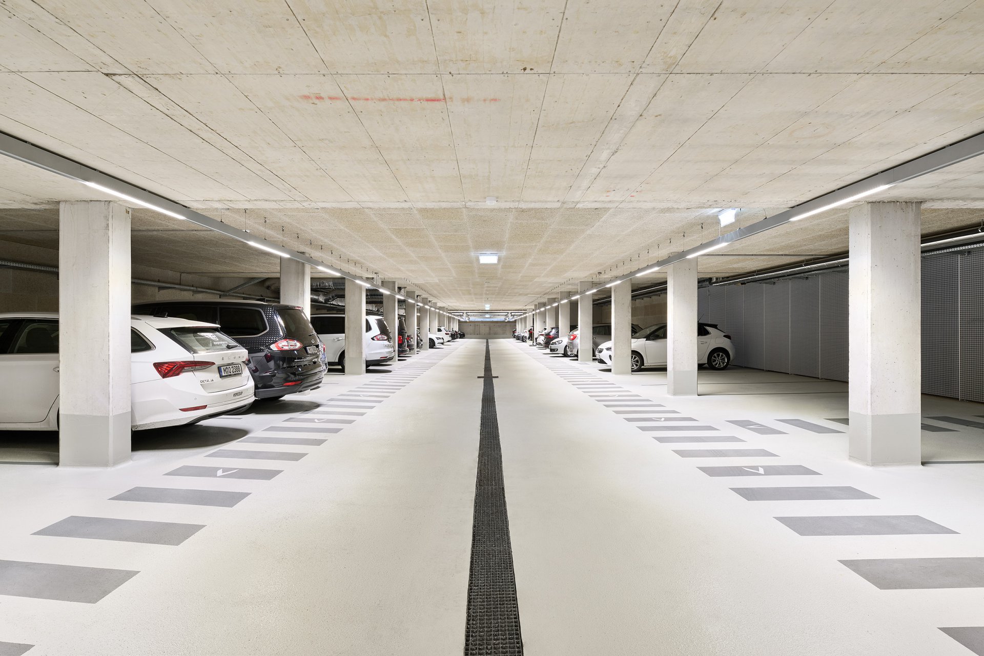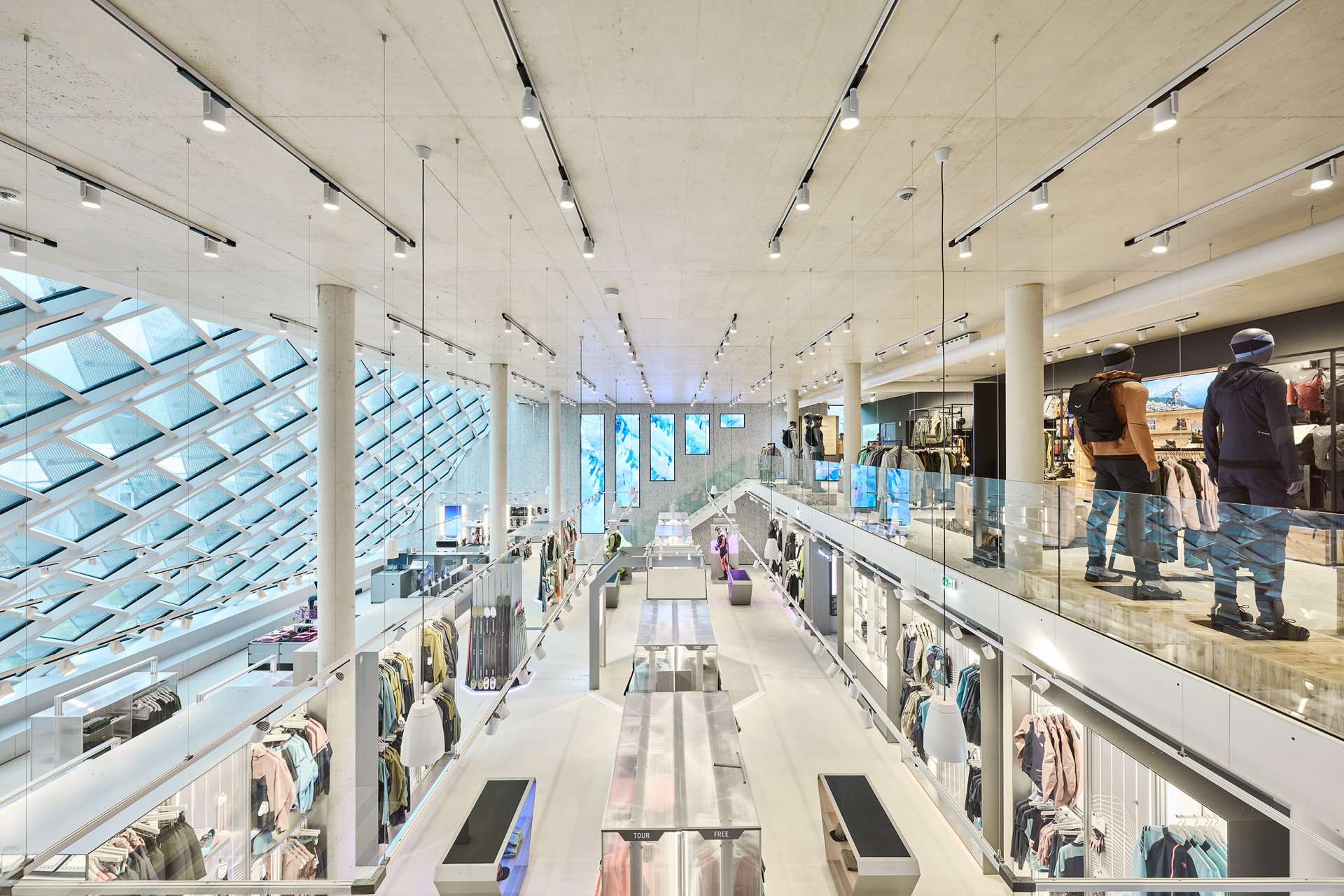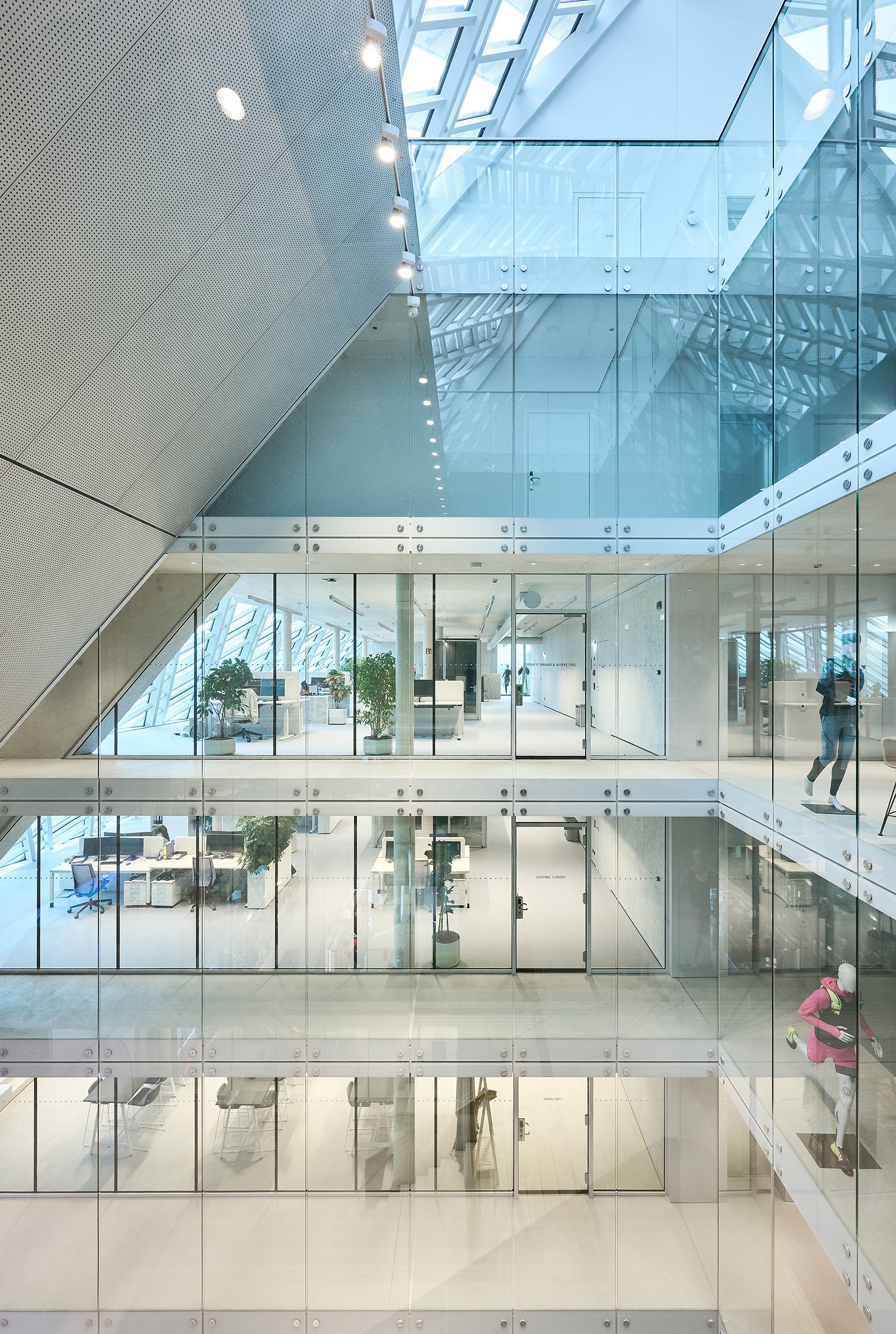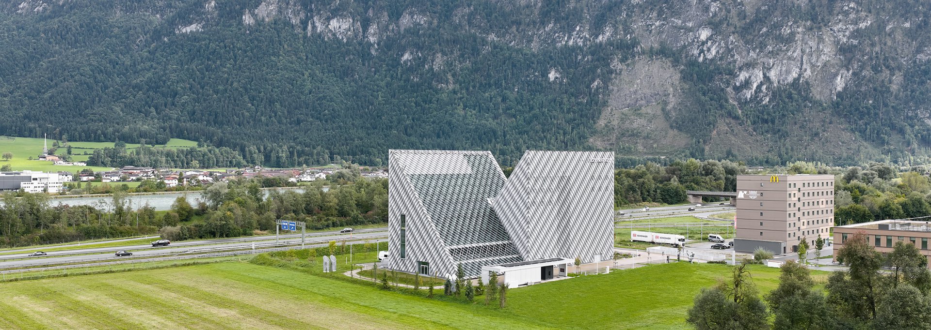 Con la costruzione della nuova sede centrale del marchio Dynafit ai piedi delle Alpi è sorta una sede aziendale moderna, funzionale e allo stesso tempo architettonicamente sofisticata, che riflette nella sua struttura i valori degli sport di montagna. Il nuovo edificio riunisce uffici e spazi commerciali con aree di sviluppo e test, oltre a un ampio bistrot, in una struttura chiaramente articolata che si integra armoniosamente nell'ambiente alpino. La progettazione strutturale ha dovuto affrontare la sfida di combinare un concetto di spazio aperto e flessibile con gli elevati requisiti tecnici di un moderno centro di innovazione. Ampie vetrate con vista sul paesaggio montano circostante caratterizzano l'aspetto dell'edificio, ma allo stesso tempo è stato necessario rinforzare in modo efficiente le ampie facciate e dimensionare in modo economico le strutture portanti. Per realizzare le ampie campate sono stati utilizzati solai piani in calcestruzzo armato ottimizzati che, in combinazione con pilastri sottili e la formazione di solai di sostegno, consentono un elevato grado di libertà spaziale. Il rinforzo dell'edificio è assicurato da massicci muri esterni in calcestruzzo armato e nuclei ascensori, che fungono da pannelli rigidi e trasferiscono in modo sicuro i carichi orizzontali del vento e della facciata alle fondamenta. Anche all'interno, la struttura è stata volutamente lasciata a vista: le superfici in calcestruzzo a vista sulle pareti e sui soffitti, così come i nodi ben definiti, creano un ambiente tecnico, sportivo e preciso, in linea con la filosofia di design del marchio. A causa dei requisiti visivi, particolare attenzione è stata prestata all'integrazione dell'infrastruttura tecnica nel sistema di copertura. Gli elementi di installazione per lampade e altoparlanti, compresi i cavi per l'impianto elettrico e sistema radiante termoattivo strutturale sono stati inclusi nella progettazione strutturale e tenuti in debita considerazione nel sistema del soffitto. La protezione antincendio strutturale è stata realizzata in tutti i piani con sezioni trasversali in calcestruzzo resistenti al fuoco. La struttura portante rimane in gran parte visibile senza rivestimento, ma soddisfa comunque gli standard di sicurezza richiesti.