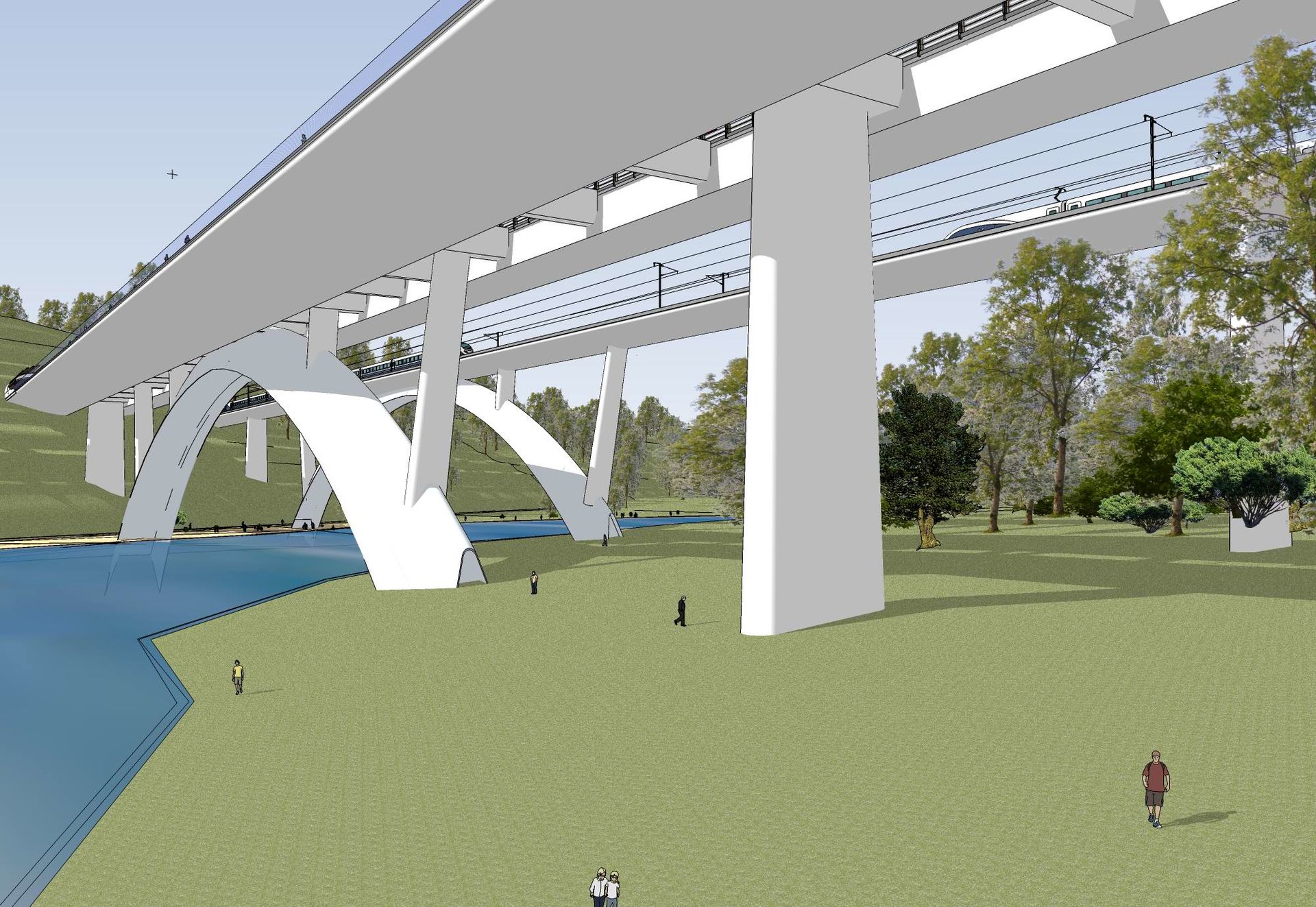 Il progetto per la costruzione del nuovo attraversamento dell’Adda lungo l’autostrada Pedemontana in Lombardia prevede due strutture a ponte separate, una per il traffico autostradale e una per quello ferroviario. Le vie di corsa fuoriescono entrambe da una galleria sul lato orografico destro dell’Adda, passano sopra il fiume e si inseriscono nel paesaggio divenendone parte. Il ponte autostradale, costituito da un doppio piano stradale e quello ferroviario attraversano la valle per una lunghezza complessiva di circa 760 m. Le sezioni delle strutture portanti della carreggiata sono realizzate in profili scatolati cavi, che sono semplici nel caso del sovrappasso ferroviario e doppi per il sovrappasso autostradale. Traverse collegano tra loro le sezioni portanti separate della carreggiata aumentandone la rigidità alla torsione le sezioni e consentendo un trasferimento del carico controllato soprattutto nella zona degli appoggi.